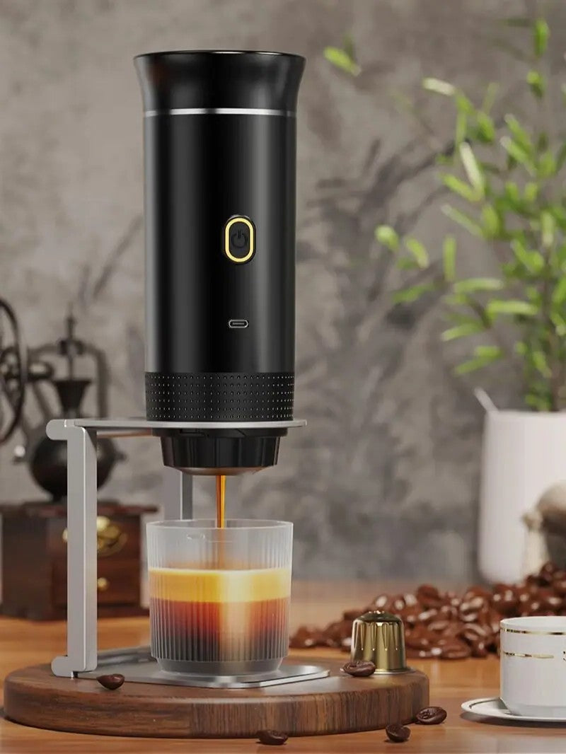 A compact, electric espresso machine designed for true coffee freedom. With 20-bar pressure, internal water heating, and 3-in-1 compatibility (capsules, pods, powder), it delivers rich, café-quality espresso anywhere—without the cord.